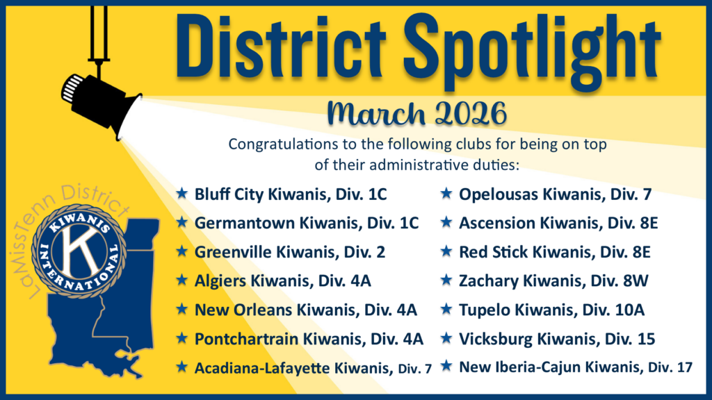 Twin Cities Kiwanis, Greenville Kiwanis, Waynesboro Kiwanis, Algiers Kiwanis, Pontchartrain Kiwanis, St. Bernard-Arabi Kiwanis, Third District Kiwanis, Dawn Busters Kiwanis, Acadiana-Lafayette Kiwanis, Lafayette Kiwanis, Opelousas Kiwanis, Ascension Kiwanis, Cortana Kiwanis, Red Stick Kiwanis, Baton Rouge Kiwanis, Zachary Kiwanis, Shreveport Kiwanis, Tupelo Kiwanis, Louisville Kiwanis, Natchitoches Kiwanis, Ponchatoula Kiwanis, Biloxi Kiwanis, Gulfport Kiwanis, Pascagoula Kiwanis, Vicksburg Kiwanis, East St. Mary Kiwanis